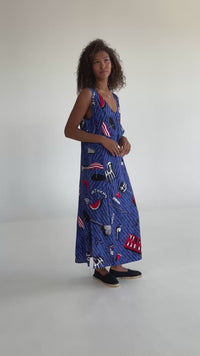 This vibrant fabric print captures the essence of a Greek summer through the playful lens of a tourist's perspective. Set against a vivid royal blue background with a magnified denim texture, the design evokes both modern casualwear and timeless Aegean skies. The print features a dynamic all-over arrangement of hand-sketched icons in crisp white and lively red—symbols that collectively celebrate the Greek summertime experience.