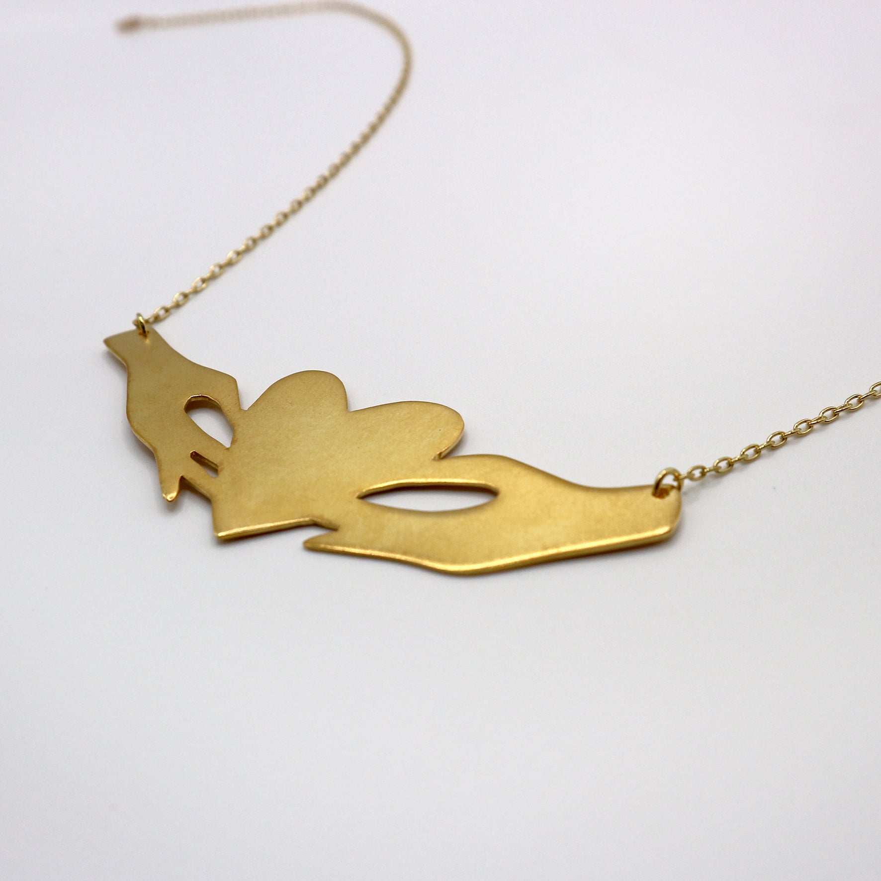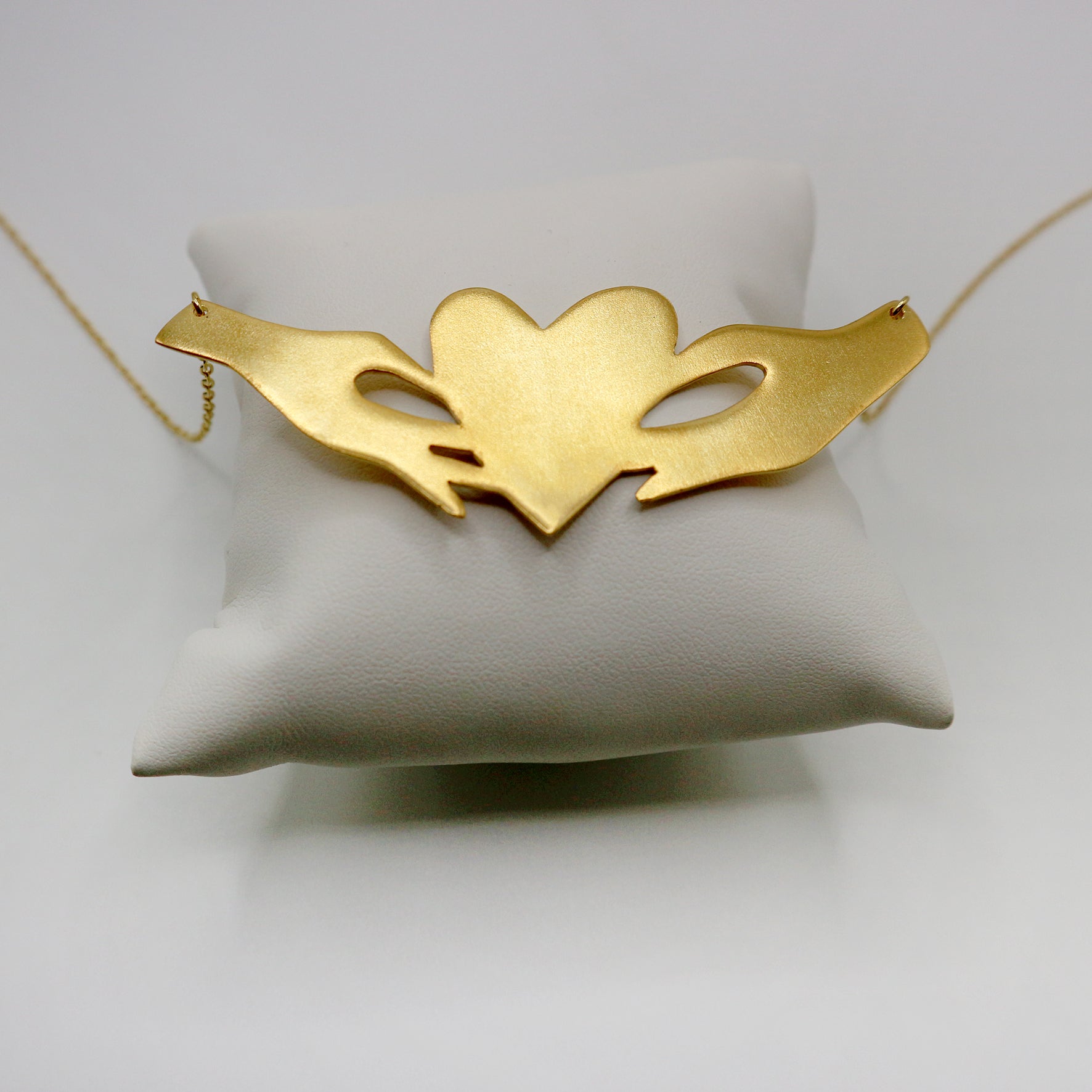 This handcrafted necklace is a heartfelt representation of connection and love. Its flat sterling silver pendant features two hands gently holding and sharing a heart, symbolizing care, unity, and generosity.