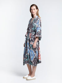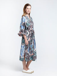 Meet our brand-new kimono robe design that only has a few slight differences from our classic beach robe design you already have loved to wear! Its length is below knee, and it doesn’t have open sides, only featuring two side openings that only come ~25cm up from hemline. Meaning it makes it less revealing and more comfortable to wear. It comes with a waist drawstring fastening so that it can be worn tied or open. Its neckline is wide and folding and its sleeves have a rever ending.
