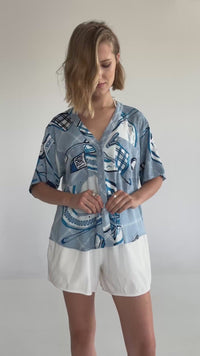 Breezy cropped shirt in our soft and lightweight viscose fabric. Trimmed with a V neckline and longer front side parts in order to tie them in a nice knot. Loose fit finished with dropped sleeves.