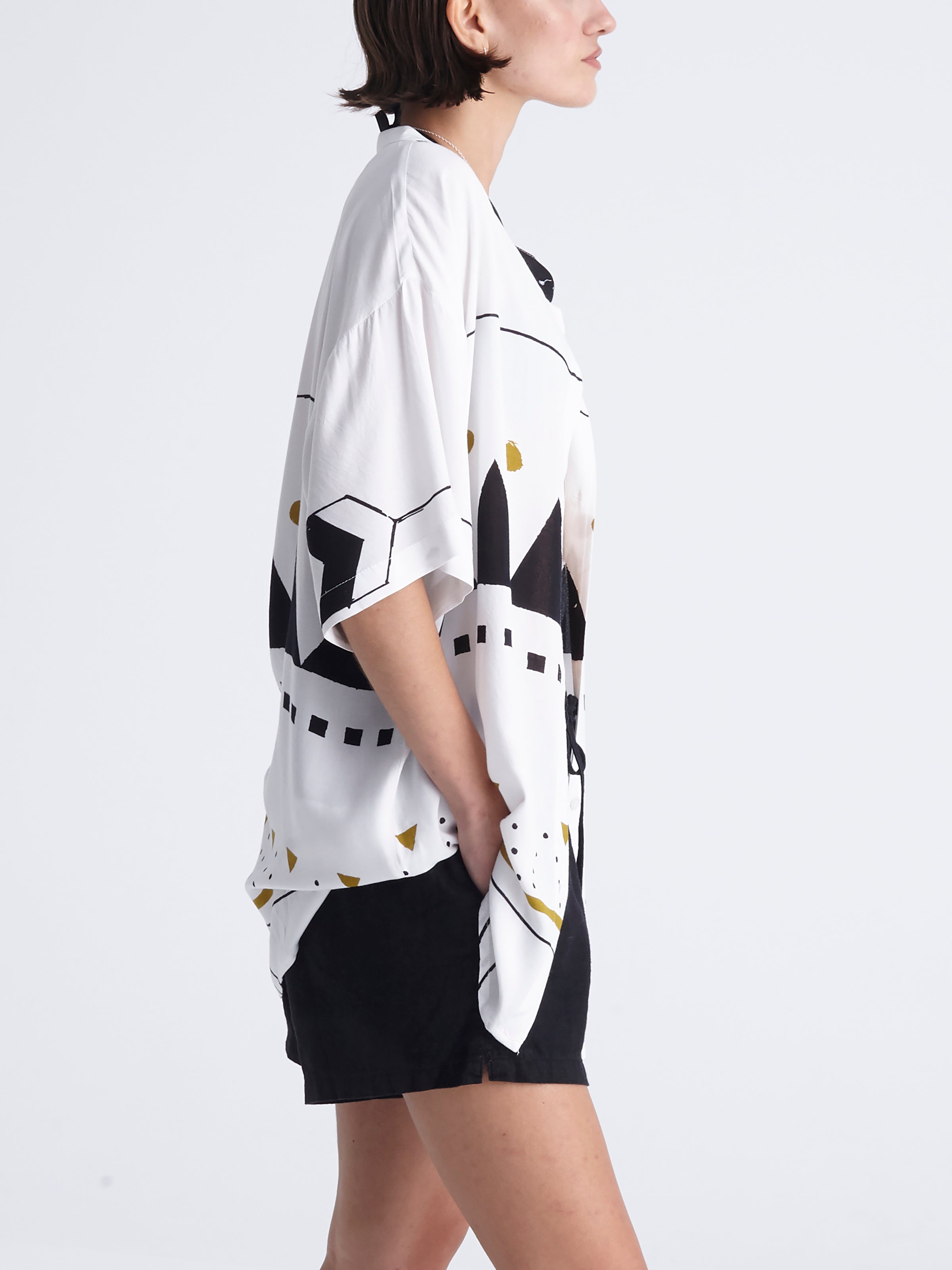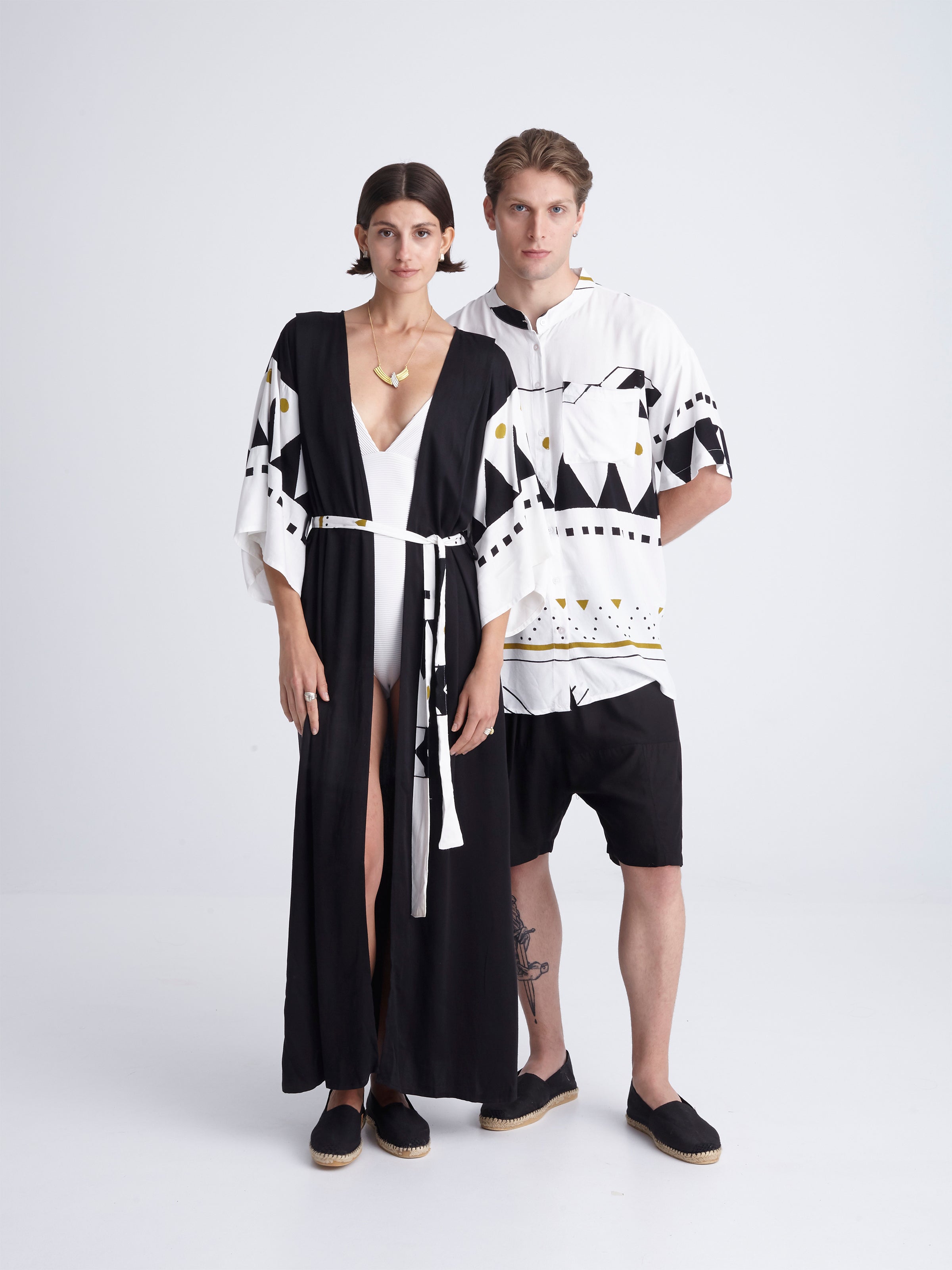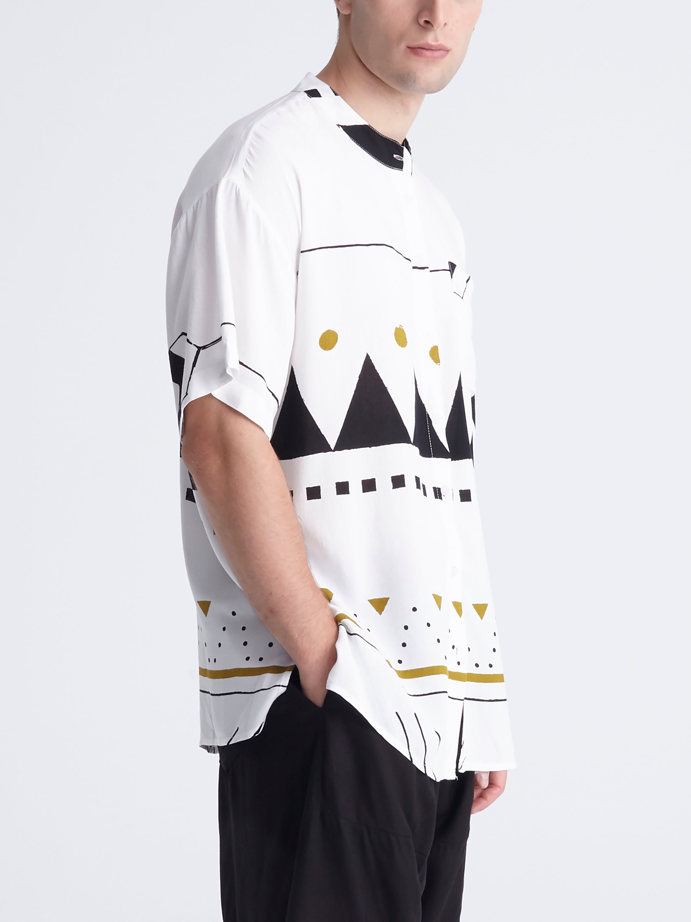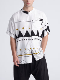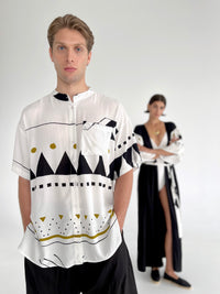 Here’s our first unisex short sleeved shirt! It has a loose fit, a mao collar and a button-up front. It comes in one size and can fit sizes from M to XL. Combining classic design details, with its informal attitude, our mao shirts for men are ideal for infusing outfits with a considered character. Providing laid-back alternatives to any tailored shirt, they are a fresh summer design that can be worn from morning to night!