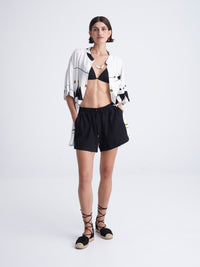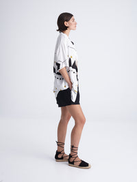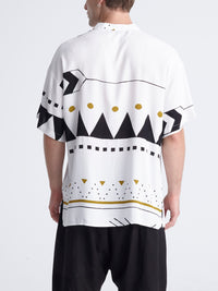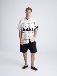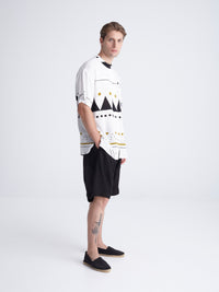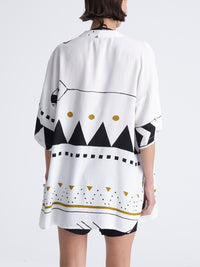 This print’s design took inspiration from the hand craftsmanship of rugs. Traditional Aztec patterns and jacquards bring out a global mix of native and urban realities. All take place in black and white, to give out a minimal and dynamic effect.