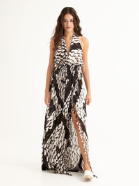Airy maxi dress cut in a long silhouette. Sleeveless with adjustable straps on the back side of the neck to tie it as you feel best. It features an overlapping V-neck in front and has an open back. Wear it over your swimsuit or over a plain black bustier. The lower part of this dress is a maxi skirt that features one front side opening, making it floating by revealing your legs while walking. It is a pull-on dress, and has a drawstring fastening on its elastic waist making it easy to fit many body types. The garment’s length is maxi but yet designed to also be worn barefoot.