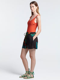 Women’s shorts are having a fashion comeback and there are too many ways to style them. Our hi-rise shorts design comes with loose leg openings which together with its smocked elastic waist, offers a very comfortable feel while wearing it; the shorts fits perfectly sizes Small and Medium. It features a pair of side pockets and a self-fabric drawstring on its waist. It can be worn on any height one feels more comfortable with, on waist or below it. The soft and lightweight viscose fabric of this shorts makes you feel you wear nothing.