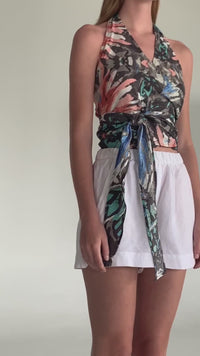 Looking for a top to match your maxi pareo skirt or your safari pants? Well here it is! Meet our brand-new wrap top that will take your beachwear from basic to stylish! This top leaves your back open while it features an elastic shirring lower back side, in order to fit perfectly on your body. It comes in all of our new collection all-over prints for a dreamy on-and-off the beach, day-to-night summer look. Totally loving the tie up trend for this new season.