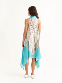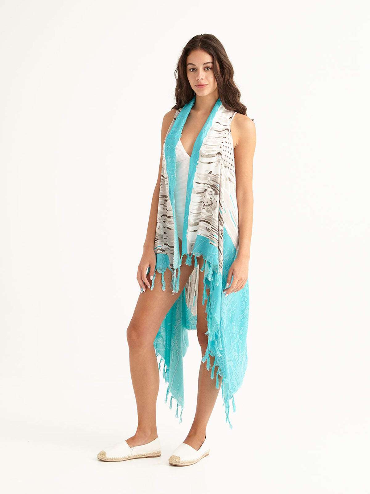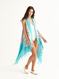 This pareo design, featuring two armholes, is created to be worn as a vest. Wear it either open as a sleeveless kimono, or wrap a plain cotton cord around your waist to close it in front, and you are ready to head to the beach! You can also style it up with one of our elastic waist bands, that would add a different touch to your beach outfit. Create your own summer tales with us your favorite way!