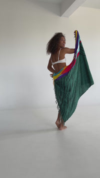 What sets "MESSINA" apart is the striking color burst along its one side: a bold, feather-like arrangement of shapes in radiant red, orange, sunshine yellow, electric purple, and sky blue. Inspired by the flamboyant plumage of tropical birds, this explosion of color balances beautifully against the monochromatic green ground, creating a visual dialogue between restraint and exuberance, serenity and celebration.