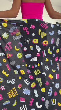 Scattered throughout the print are whimsical, flirtatious phrases like “more amor por favor,” “feelings unlocked,” and “let’s make out”—each one a snapshot of raw, unfiltered emotion with a wink. The contrast between the dark background and the bright, bubbly shapes creates an electric energy, making this print perfect for statement garments that radiate personality and play.