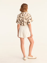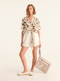 Subtle yet striking, this boho-chic print creates the elegant illusion of cascading tassels across the surface—printed to mimic the texture and movement of real, hanging fringe. In a soft, earthy palette of ecru and beige, the design envelops the fabric in an all-over pattern that feels tactile and dimensional, while remaining entirely smooth to the touch.