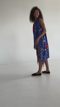 This pareo design, featuring two armholes, is created to be worn as a vest. Wear it either open for a relaxed drape, or fastened for a more structured look, and you are ready to head to the beach! You can also style it up with one of our elastic waist bands, that would add a different touch to your beach outfit.